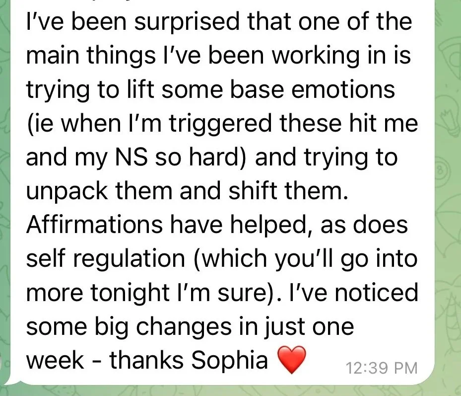 This is your opportunity to bring your questions and receive live personalised support, coaching and guidance from Sophia as journey along your Nervous System Soothing path.